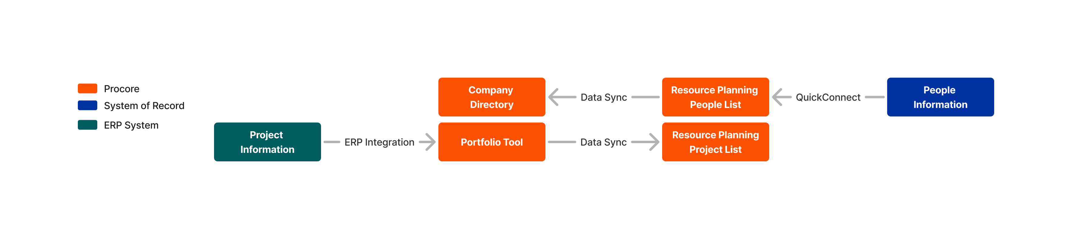 客户在记录系统中管理人员并使用QuickConnect将人员集成到资源规划中。 人员信息随后会同步到 Procore 的核心工具中。 同时,客户会使用ERP集成来管理同步到 Procore 核心工具的项目信息。 项目信息随后会同步到资源计划。
